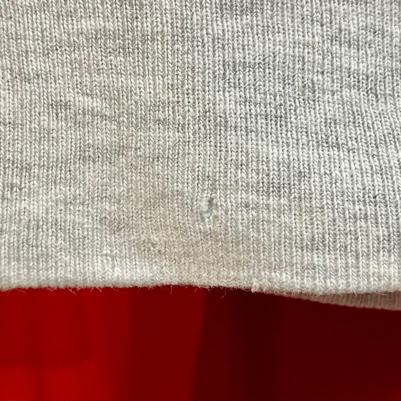 バック左下の裾リブにピンホール(画像8枚目)、フロント左下にステッチの解け(画像9枚目)がございます。